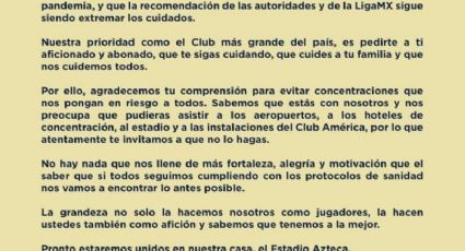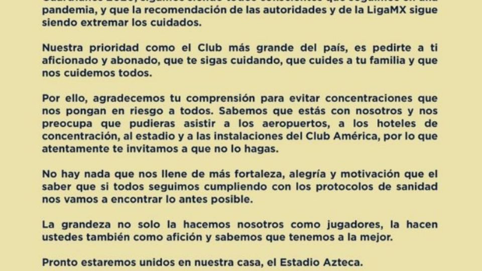 Sabiendo que tiene un gran arrastre en la población del país por su gran número de aficionados, el América emitió un comunicado en el que invitaba a todos sus seguidores a mantener las medidas de precaución, pues no quieren que nadie se confíe de que, al reactivarse el futbol, piensen que ya no hay que tener cuidados para evitar contagios, así como para evitar reuniones para apoyar al equipo.